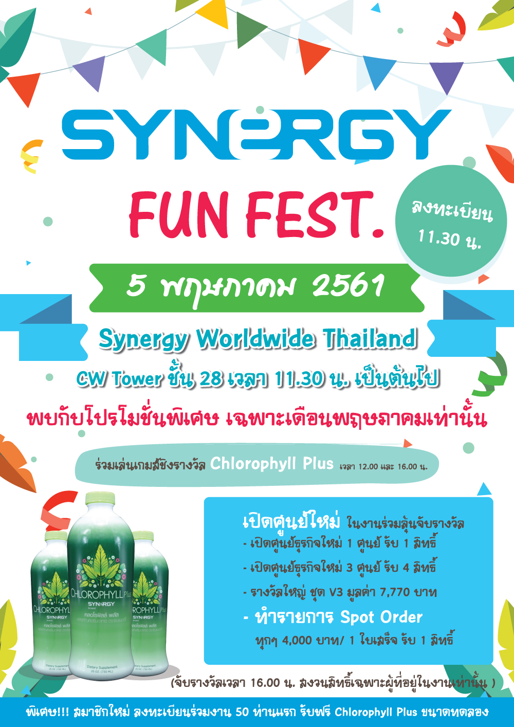 วันเสาร์ที่ 5 พฤษภาคม 2561 พบกับงาน Fun Fest และโปรโมชั่นพิเศษ ณ Synergy Worldwide Thailand CW Tower ชั้น 28
